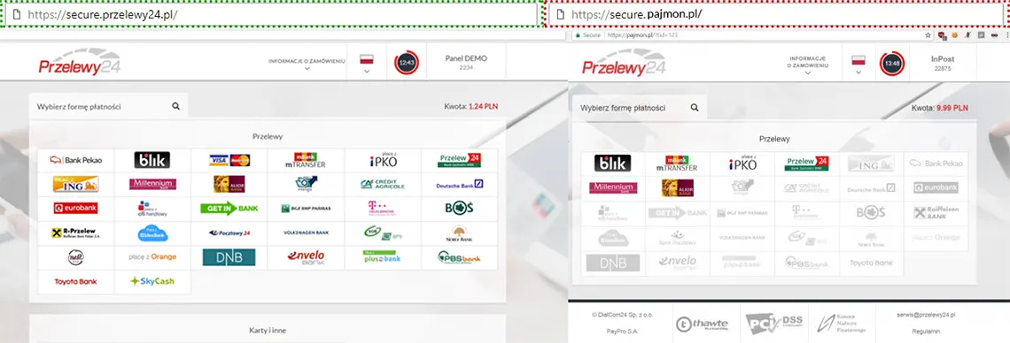 Kluczowym momentem transakcji internetowej jest wybranie metody płatności na formatce operatora i dokończenie jej na stronie banku. Dlatego zwróć szczególną uwagę na pasek adresowy, w którym powinien znaleźć się wyłącznie prawidłowy adres operatora. Dla porównania, zestawienie strony oszusta i serwisu Przelewy24.