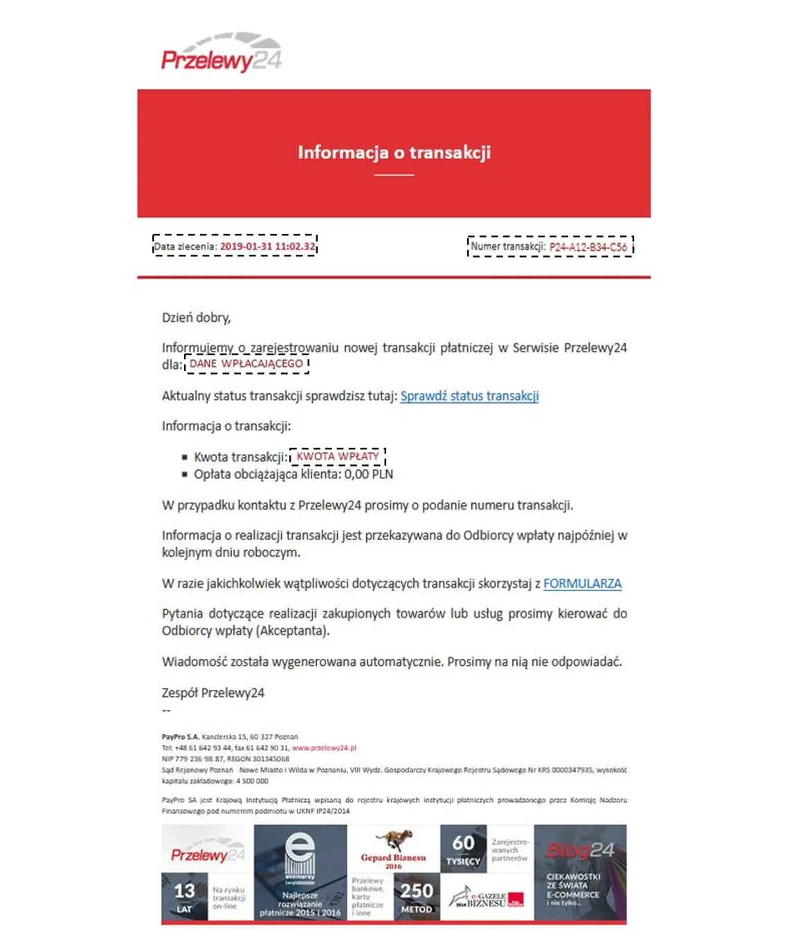 Poniżej wzór prawidłowego potwierdzenia z serwisu Przelewy24.